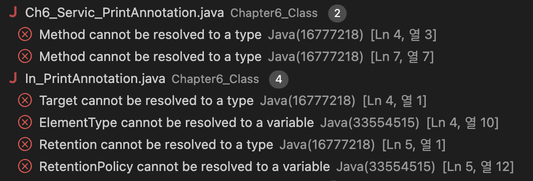 자바 어노테이션을 실습 중 계속해서 cannot be resolved 에러가 떴습니다. (vscode 사용 중, homebrew->openjdk .dng로 설치)