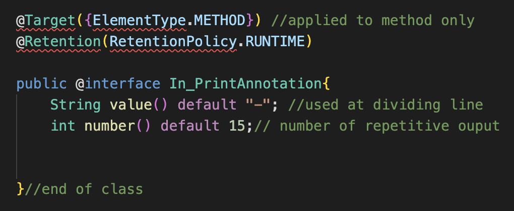 우선 Target나 Retention등 어노테이션 인터페이스 파일에 들어가는 메소드들은 어노테이션 파일 위에