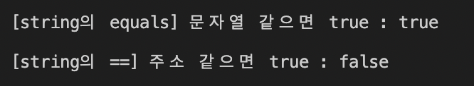 그러니 String 외의 다른 모든 클래스를 equals로 비교하면 주소값을 비교해서 리턴하고 String 클래스의 값을 equals로 비교하면 값을 비교합니다.