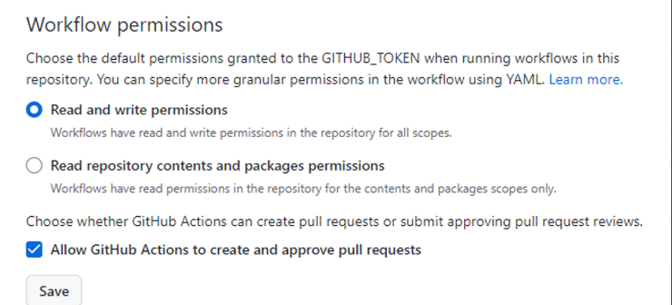 그 뒤에 또 pr이 안되서 삽질했는데 아래에 내려보면 allow github actions to create and approve pull requests 라는 섹션이 있다. 거기 꼭 체크해주도록 하자...