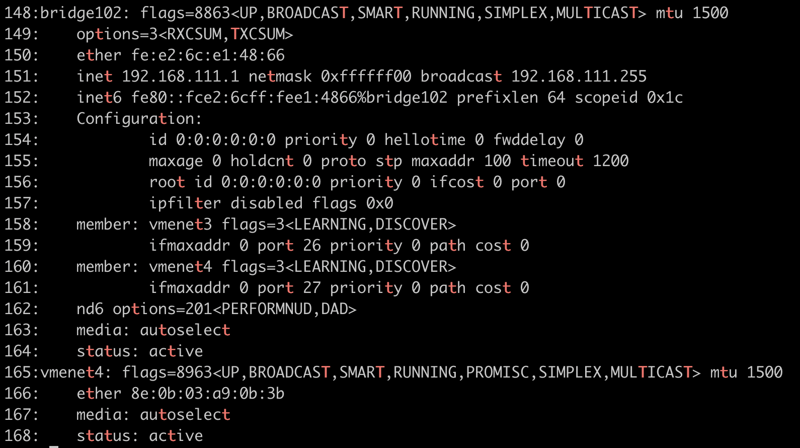 그러면 16진수로 표기된 글자랑 엄청 많은 뭐가 쭉쭉쭉 뜬다. 그 중에 vmware에 할당된 ip를 확인하기 위해서는 가장 아래에 있는 bidge flag <UP, BROADCAST, SMART.....> 등등이 있는 바로 아래에 inet을 봐준다!