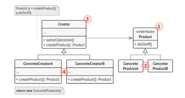 - 생성 메서드는 구체 클래스들이 각각 특정 객체를 생성하여 반환할 수 있도록 하는 abstract 메서드이다.