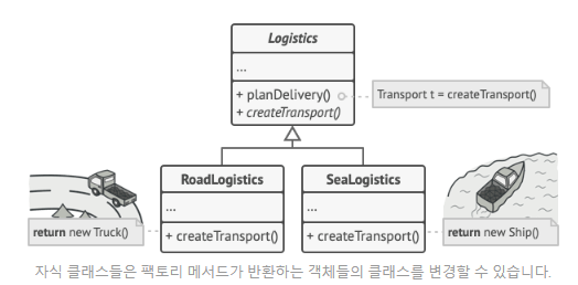 - 부모 클래스에서 객체들을 생성할 수 있는 인터페이스를 제공하고 자식 클래스들이 생성될 객체들의 유형을 변경할 수 있도록 하는 패턴