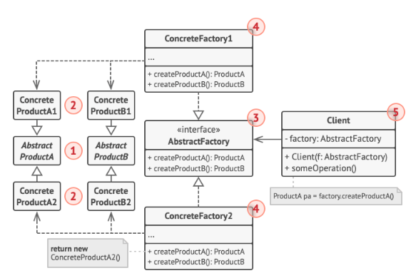 - ConcreteFactory = ModernFurnitureFactory, VictorianFurnitureFactory, ArtDecoFurnitureFactory