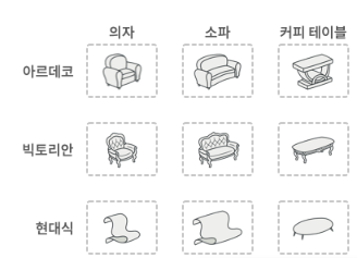 제품들은 종류(의자, 소파, 테이블)와 스타일(Modern, Victorian, ArtDeco) 두 가지 축으로 분류됩니다.