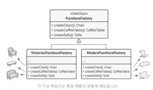 - AbstractFactory = FurnitureFactory 인터페이스