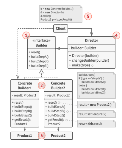 - Builder 인터페이스: 모든 빌더에 공통인 생성 단계들 선언