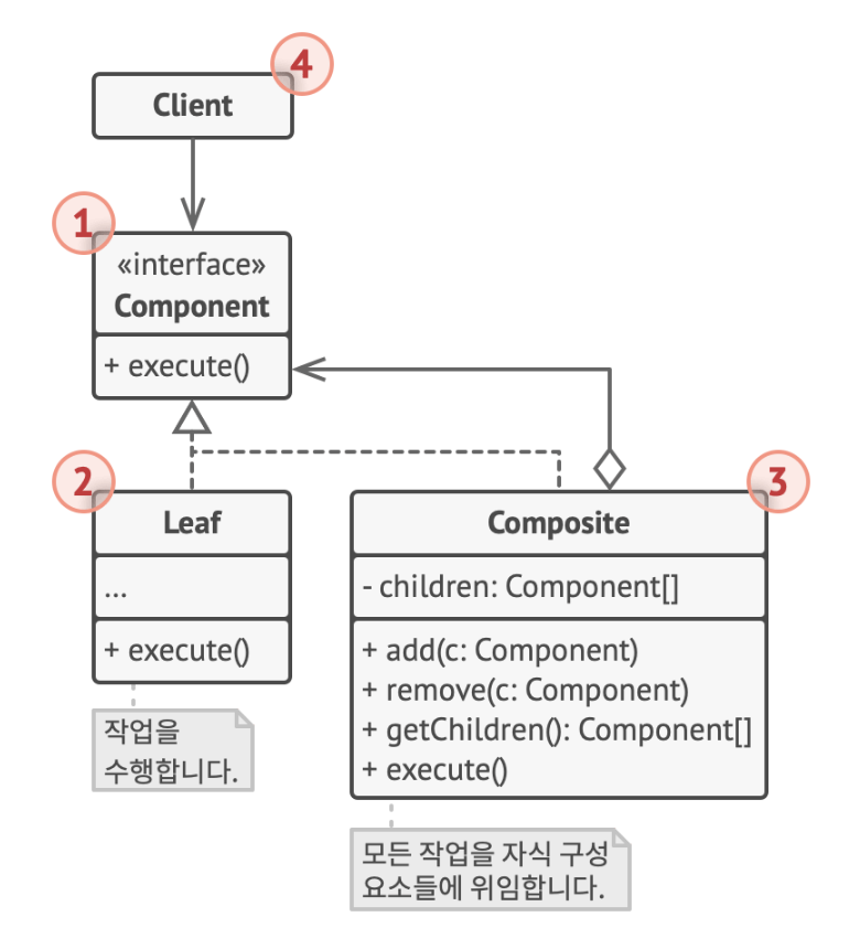 컴포짓 패턴은 서로 다른 타입 같지만 결국 같은 동작을 하는 객체들을 공통 인터페이스로 묶어 트리 구조로 다루는 패턴입니다.